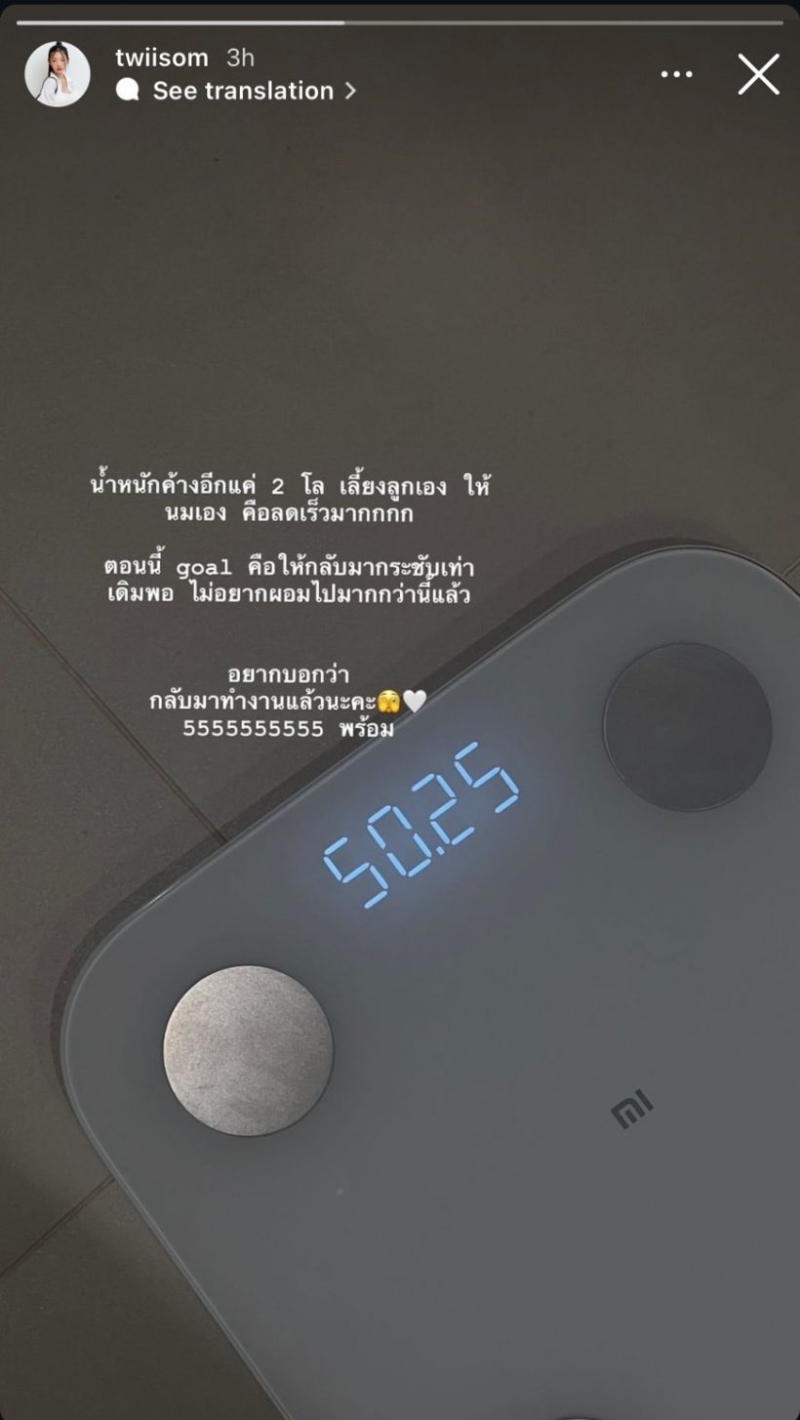 ล่าสุด ส้ม ณัฐชา เผยน้ำหนักตัว ลดลงมาเหลือ 50.25 แล้ว พร้อมข้อความระบุว่า น้ำหนักค้างอีกแค่ 2 โล เลี้ยงลูกเอง ให้นมเอง คือลดเร็วมาก ตอนนี้ goal คือ ให้กลับมากระชับเท่าเดิมพอ ไม่อยากผอมไปมากกว่านี้แล้ว อยากบอกว่า กลับมาทำงานแล้วนะคะ 555555555555 พร้อม
