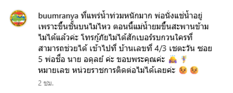 ทั้งนี้ บุ๋ม รัญญา ได้โพสต์ข้อความพร้อมเผยว่า ที่แพร่น้ำท่วมหนักมาก พ่อนั่งแช่น้ำอยู่ เพราะขึ้นชั้นบนไม่ไหว ตอนนี้แม่น้ำยมขึ้นสะพานข้ามไม่ได้แล้วค่ะ โทรกู้ภัยไม่ได้สักเบอร์รบกวนใครที่สามารถช่วยได้ เข้าไปที่ บ้านเลขที่ 4/3 เชตะวัน ซอย 5 พ่อชื่อ นายอดุลย์ ค่ะ ขอบพระคุณค่ะ หมายเลข หน่วยราชการติดต่อไม่ได้เลยค่ะ ท่ามกลางแฟนๆต่างส่งกำลังใจมากมาย
