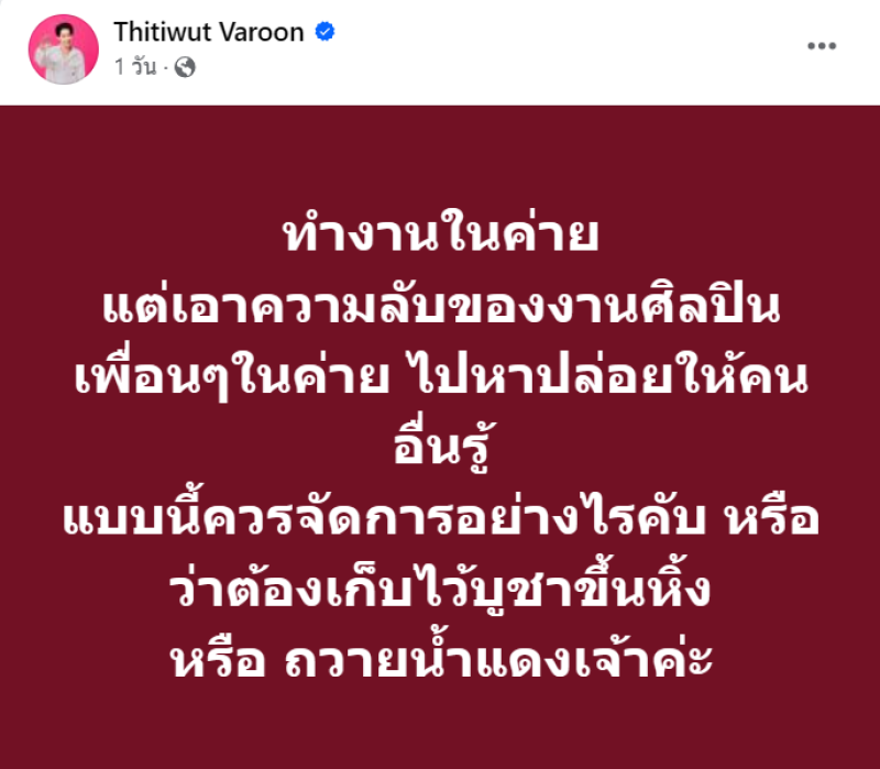 เรียกได้ว่า เป็นบุคคลที่มีประเด็นดรามาตลอด อย่าง บิ๊ก ผู้ใหญ่บ้าน ฟินแลนด์ ที่มีปัญหาเข้ามาไม่จบไม่สิ้นทั้งที ล่าสุดทำเอาต้องเดือดอีกแล้ว เมื่อบิ๊กได้ออกมาโพสต์ผ่านfacebook Thitiwut Varoon โดยเผยว่า ทำงานในค่าย แต่เอาความลับของงานศิลปินเพื่อนๆในค่าย ไปหาปล่อยให้คนอื่นรู้ แบบนี้ควรจัดการอย่างไรคับ หรือว่าต้องเก็บไว้บูชาขึ้นหิ้ง หรือ ถวายน้ำแดงเจ้าค่ะ