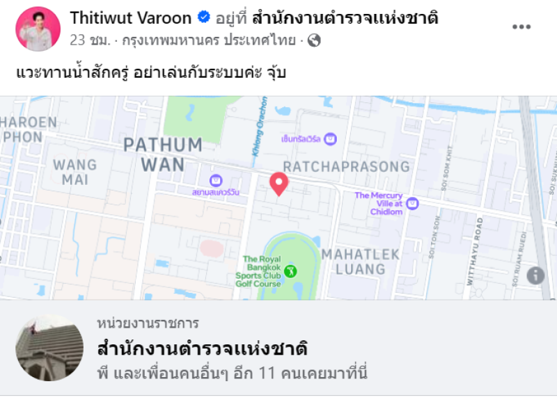 และยังโพสต์ เช็คอินที่ สำนักงานตำรวจเเห่งชาติ ระบุแคปชั่นว่า แวะทานน้ำสักครู่ อย่าเล่นกับระบบค่ะ จุ้บ