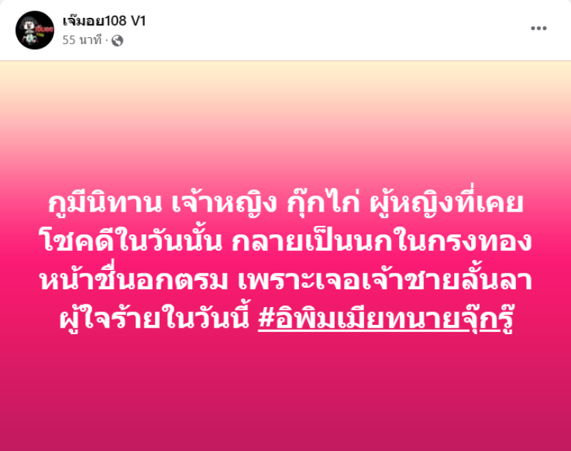 เรียกได้ว่า มีเรืท่องต้องให้จับตาอีกแล้ว เมื่อทางเพจดัง อย่าง เจ๊มอย108 V1 ได้ออกมาโพสต์เล่านินทา ว่า กูมีนิทาน เจ้าหญิง กุ๊กไก่ ผู้หญิงที่เคยโชคดีในวันนั้น กลายเป็นนกในกรงทอง หน้าชื่นอกตรม เพราะเจอเจ้าชายลั้นลาผู้ใจร้ายในวันนี้ #อิพิมเมียทนายจุ๊กรู๊.