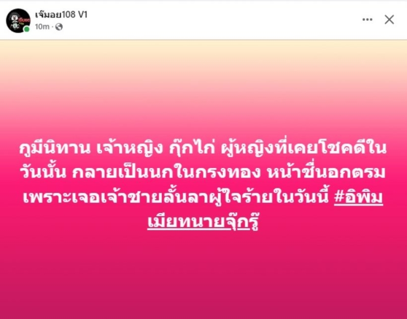 จากกรณีเพจดังอย่าง เจ๊มอย108 V1 ได้ออกมาโพสต์โดยระบุว่า ดาราสาวคนหนึ่งที่หน้าชื่นอกตรมเพราะผู้ชาย โดยเจ๊มอยเกริ่นเอาไว้ว่า ...กูมีนิทาน เจ้าหญิง กุ๊กไก่ ผู้หญิงที่เคยโชคดีในวันนั้น กลายเป็นนกในกรงทอง หน้าชื่นอกตรม เพราะเจอเจ้าชายลั้นลาผู้ใจร้ายในวันนี้ #อิพิมเมียทนายจุ๊กรู๊ งานนี้ทำแฟนๆแห่ดาว่าใครกันนะลืออาจมีข่าวเตียงหัก