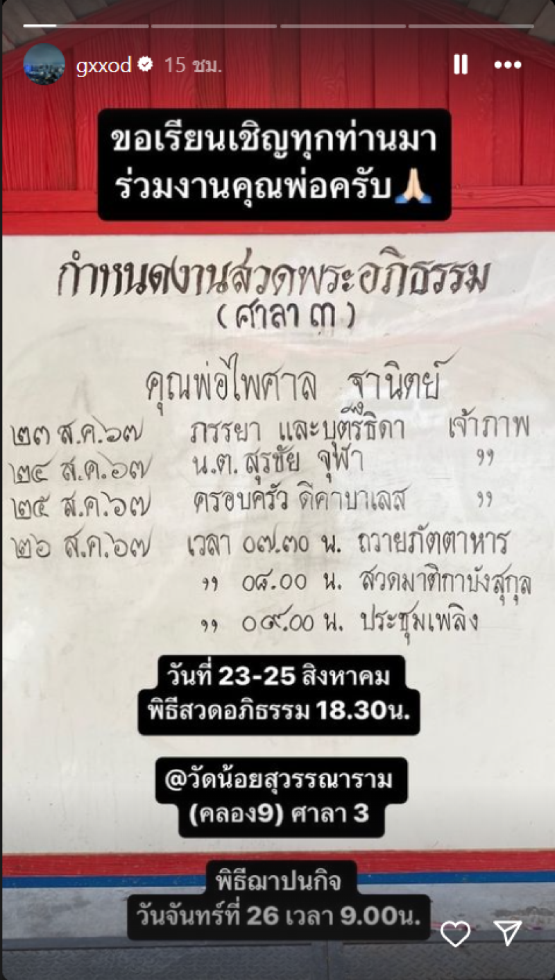 เรียกได้ว่า เป็นพระเอกชื่อดัง อย่าง ก็อต อิทธิพัทธ์ ที่ได้สูญเสียคุณพ่ออันเป็นที่รักไปตลอดกาล ล่าสุดก๊อต ได้แจ้งข่าวเศร้าผ่านทางอินสตาแกรมส่วนตัว เป็นกำหนดการสวดพระอภิธรรมคุณพ่อไพศาล ซึ่งจัดขึ้น ณ ศาลา 3 วัดน้อยสุวรรณาราม (คลอง9) ต.แพรกษาใหม่ อ.เมืองสมุทรปราการ จ.สมุทรปราการ