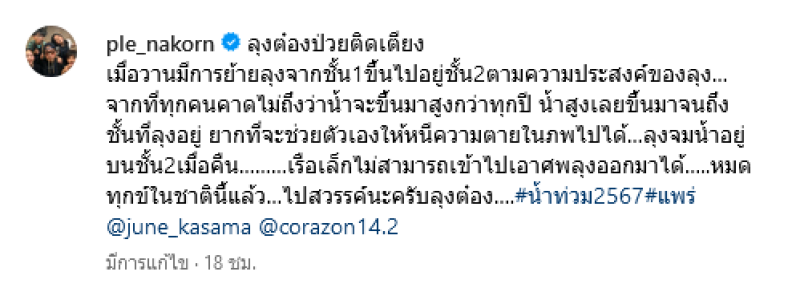 เป็นอีกหนึ่งเรื่องเศร้าสุดสะเทือนใจเมื่อนักแสดงหนุ่ม เปิ้ล นาคร ได้ขี่เจ็ทสกีช่วยเหลือผู้ประสบภัยน้ำท่วม จังหวัดแพร่ แต่กลับพบข่าวเศร้า ลุงต๋อง ผู้ป่วยติดเตียง จมน้ำเสียชีวิต อยู่บนชั้น 2ของบ้าน น้ำท่วมสูงเรือเล็กไม่สามารถเข้าไปเอาศพลุงออกมาได้