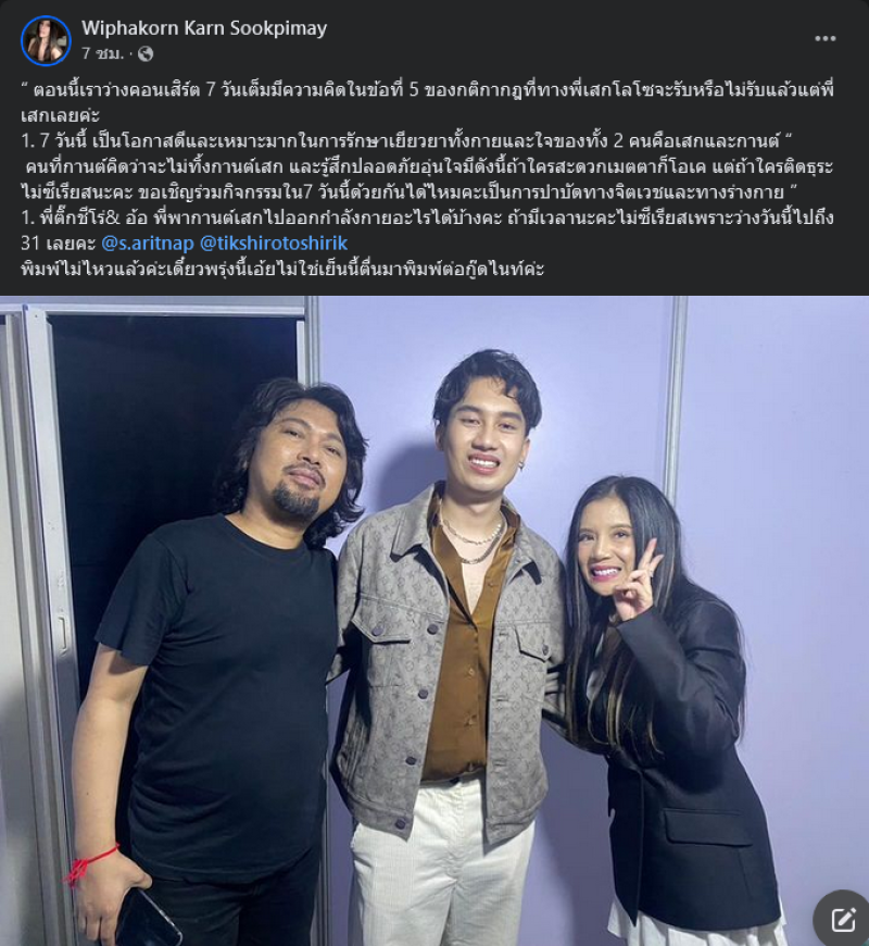 พร้อมกันนี้ยังโพสต์ภาพครอบครัว และข้อความเกี่ยวกับกฎกติกาที่ เสก โลโซ ต้องปฏิบัติตาม หรือไม่ก็แล้วแต่เพื่อเป็นการเยียวยาจิตใจของทั้งสองฝ่าย หลังจากที่ กานต์ ได้บอกว่า เป็นเรื่องละเอียดอ่อนที่เกี่ยวกับครอบครัว และเปิดข้อตกลงที่ยื่นให้กับ เสก โลโซ
