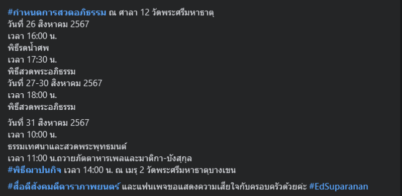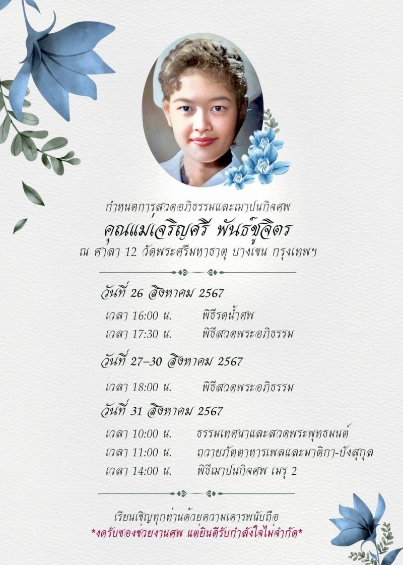 เป็นอีกหนึ่งเรื่องเศร้าของวงการบันเทิงเมื่อทางเพจ ดาราภาพยนตร์ ได้โพสแจ้งข่าวเศร้าของ เอ็ด ศุภรานันท์ พันธ์ชูจิตร รองอันดับ 3 นางสาวไทย 2531 ได้สูญเสียคุณแม่ เจริญศรีพันธ์ชูจิตร หลังเพิ่งเสียคุณพ่อเพียงเดือนเดียว สวดพระอภิธรรม #ศาลา12 #วัดพระศรีบางเขน โดย เอ็ด ได้โพสต์ว่า