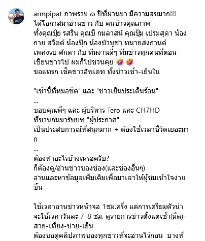 แต่เอาจริงๆ เรตติ้งก็มีขึ้นลงนะครับทุกคน ขอบคุณทั้งสุขและทุกข์ที่ผ่านมาในการทำงาน ทุกเรื่อง สอนให้เราเติบโต และ ก้าวต่อไป ประโยคท้ายเมียได้กล่าวไว้ให้คิด! #armpipat #ch7hdnews #TERODIGITAL