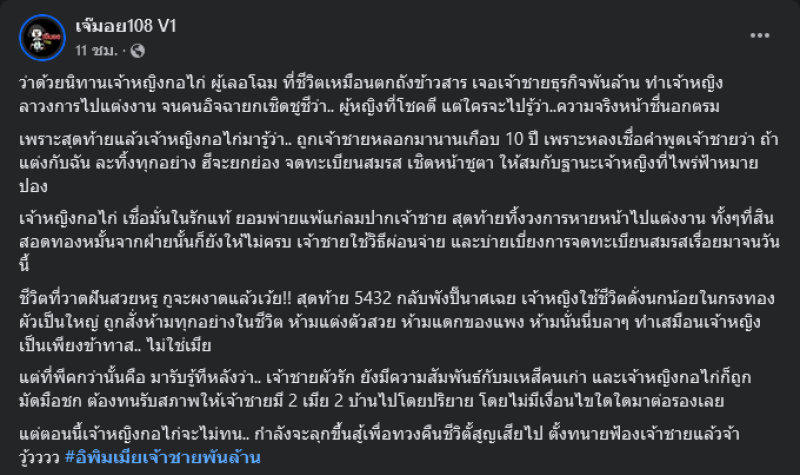 เรียกได้ว่ามีเรื่องให้ชาวเน็ตได้ตามสืบกันออยู่ทุกวันสำหรับเรื่องราวในวงการบันเทิงเมื่อ เพจดังเจ๊มอย108 v1 มีประเด็นข่าวอักษรย่อแซ่บๆออกมาให้เผือกกันอีกแล้ว โดยคราวนี้เป็นเรื่องของ"เจ้าหญิงกอไก่ ผู้เลอโฉม" ที่โดนสามี"เจ้าชายธุรกิจพันล้าน"หลอกแต่งงานจนต้องลาวงการไปแต่สุดท้ายต้องไปกล้ำกลืนฝืนทนรับสภาพ3คนผัวเมีย โดยเจ๊มอย ได้โพสต์ว่า ว่าด้วยนิทานเจ้าหญิงกอไก่ ผู้เลอโฉม ที่ชีวิตเหมือนตกถังข้าวสาร เจอเจ้าชายธุรกิจพันล้าน ทำเจ้าหญิงลาวงการไปแต่งงาน จนคนอิจฉายกเชิดชูชีว่า.. ผู้หญิงที่โชคดี