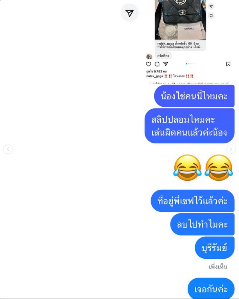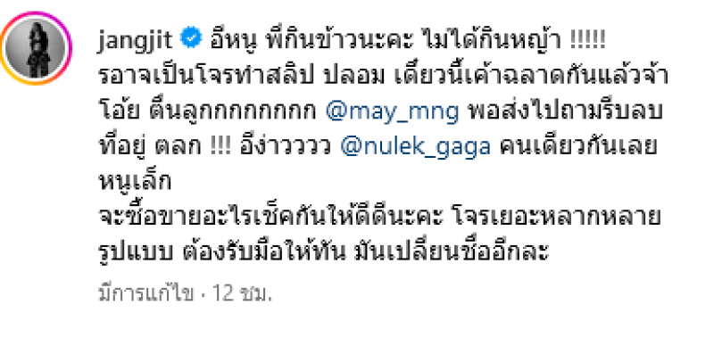 ทางด้าน แจง ได้โพสต์ข้อความว่า อีหนู พี่กินข้าวนะคะ ไม่ได้กินหญ้า รอาจเป็นโจรทำสลิป ปลอม เดี๋ยวนี้เค้าฉลาดกันแล้วจ้าโอ้ย ตื่นลูกกกกกกก พอส่งไปถามรีบลบที่อยู่ ตลก !!! อีง่าวววว คนเดียวกันเลยหนูเล็ก จะซื้อขายอะไรเช็คกันให้ดีดีนะคะ โจรเยอะหลากหลายรูปแบบ ต้องรับมือให้ทัน มันเปลี่ยนชื่ออีกละ