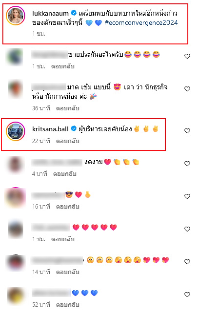พร้อมเขียนข้อความว่า เตรียมพบกับบทบาทใหม่อีกหนึ่งก้าวของลักขณาเร็วๆนี้ #ecomconvergence2024 ทางด้านอดีตสามี บอล กฤษณะ ได้เข้ามาคอมเมนต์ว่า ผู้บริหารเลยคับน้อง ทั้งยังมีคนในวงการเเละเพื่อนเข้ามาแสดงความยินดีมากมาย