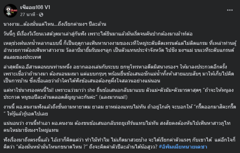 มีเรื่องมาเมาท์อยู่ทุกวันสำหรับเรื่องราวของวงการบันเทิงแต่ล่าสุดเป็นเรื่องของวงการนางงาม เมื่อเจ๊มอย108 V1 ได้ออกมาเมาท์ว่า นางงาม...ต้องมั่นแค่ไหน...ถึงเรียกค่ามงฯ ปีละล้าน วันนี้xู มีเรื่องวิเวียนเวสต์วูดมาเล่าสู่กันฟัง เพราะได้ยินมาแล้วมันเริ่ดจนคันปากต้องมาเม้าท์ต่อ เหตุช่วงฝนเทน้ำหลากแบบนี้ ก็เป็นฤดูกาลเฟ้นหานางงามของเวทีใหญ่ระดับติดเทรนด์แต่ไม่ติดแกรม ที่เหล่าท่านผู้อำนวยการต้องเฟ้นหาสาวงาม