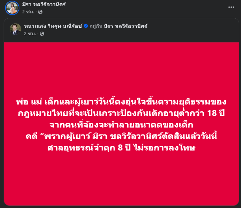 ล่าสุด เอ๋ มิรา ก็ได้เคลื่อนไหวผ่านทางเฟซบุ๊คส่วนตัวโดยการแชร์โพสต์ของทนายเก่งว่า พ่อ แม่ เด็กและผู้เยาว์วันนี้คงอุ่นใจขึ้นความยุติธรรมของกฎหมายไทยที่จะเป็นเกราะป้องกันเด็กอายุต่ำกว่า 18 ปี จากคนที่จ้องจะทำลายอนาคตของเด็ก คดี พรากผู้เยาว์ มิรา ชลวิรัลวานิศร์ตัดสินแล้ววันนี้ ศาลอุทธรณ์จำคุก 8 ปี ไม่รอการลงโทษ ท่ามกลางแฟนๆคอมเมนต์แสดงความยินดีมากมาย