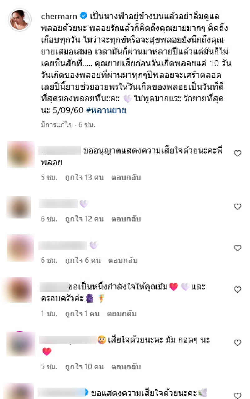 โดย พลอย ได้เขียนข้อความคิดถึงว่าเป็นนางฟ้าอยู่ข้างบนแล้วอย่าลืมดูแลพลอยด้วยนะ พลอยรักแล้วก็คิดถึงคุณยายมากๆ คิดถึงเกือบทุกวัน ไม่ว่าจะทุกข์หรือจะสุขพลอยยังนึกถึงคุณยายเสมอเสมอ เวลามันก็ผ่านมาหลายปีแล้วแต่มันก็ไม่เคยชินสักที คุณยายเสียก่อนวันเกิดพลอยแค่ 10 วัน วันเกิดของพลอยที่ผ่านมาทุกๆปีพลอยจะเศร้าตลอดเลยปีนี้ยายช่วยอวยพรให้วันเกิดของพลอยเป็นวันที่ดีที่สุดของพลอยทีนะคะ ไม่พูดมากแระ รักยายที่สุดนะ 5/09/60 #หลานยาย