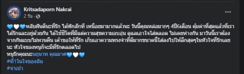 โพสต์บอกว่า หลับฝันดีนะที่รัก ได้พักสักที เหนื่อยมามากแล้วนะ วันนี้คุณหล่อมากๆ 4ปี6เดือน คุ้มค่าที่สุดแล้วที่เราได้รักและอยู่ด้วยกัน ได้ใช้ชีวิตที่มีแต่ความสุขความอบอุ่น ดูแลเอาใจใส่ตลอด ไม่เคยห่างกัน มาวันนี้เราต้องจากกันแบบไม่หวนคืน เค้าขอให้ที่รัก