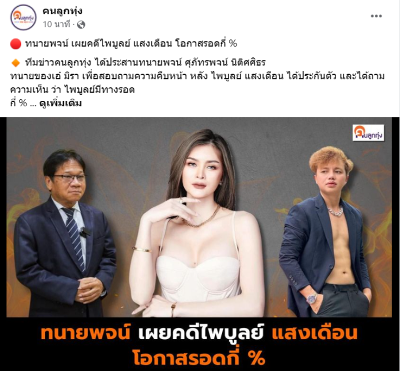 ล่าสุด ทางเพจคนลูกทุ่ง ได้ออกมาเผยว่า ทีมข่าวคนลูกทุ่ง ได้ประสานทนายพจน์ ศุภัทรพจน์ นิติศศิธร ทนายของเอ๋ มิรา เพื่อสอบถามความคืบหน้า หลัง ไพบูลย์ แสงเดือน ได้ประกันตัว และได้ถามความเห็น ว่า ไพบูลย์มีทางรอด กี่ %