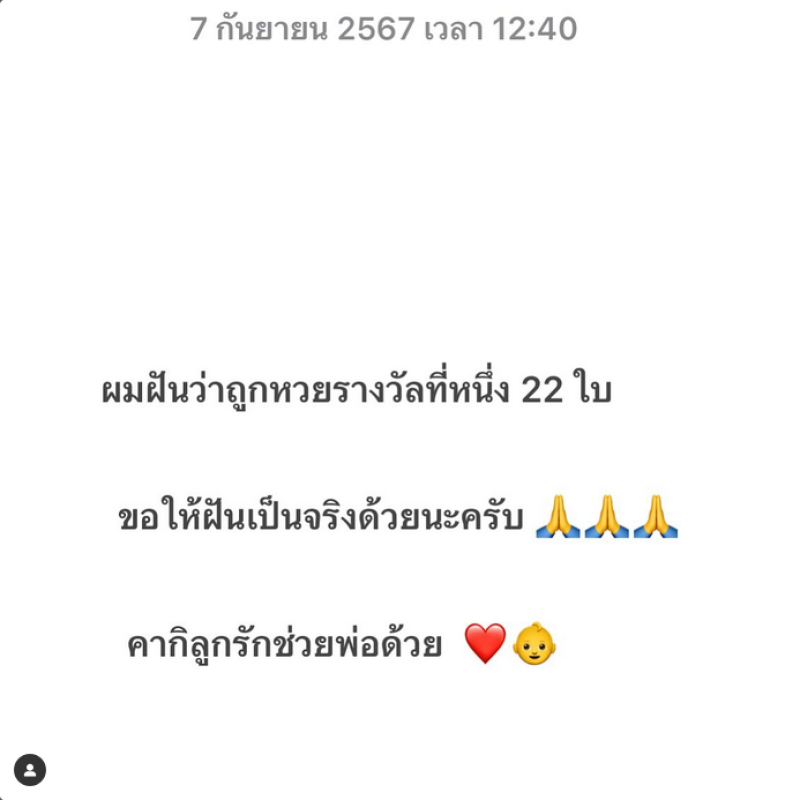 จากประเด็นที่ก่อนหน้านี้นักแสดงตลกและพิธีกรอารมณ์ดีที่ขึ้นแท่นเป็นคุณพ่อมือใหม่สำหรับ แจ็ค แฟนฉัน ที่ได้โพสต์ข้อความฝันว่า ผมฝันว่าถูกรางวัลที่1 22ใบ ขอให้ฝันเป็นจริงด้วยนะครับ คากิลูกรักช่วยพ่อด้วย ซึ่งทำเอาแฟนๆได้ถามหาถึงเลขที่ฝันกันอย่างมาก