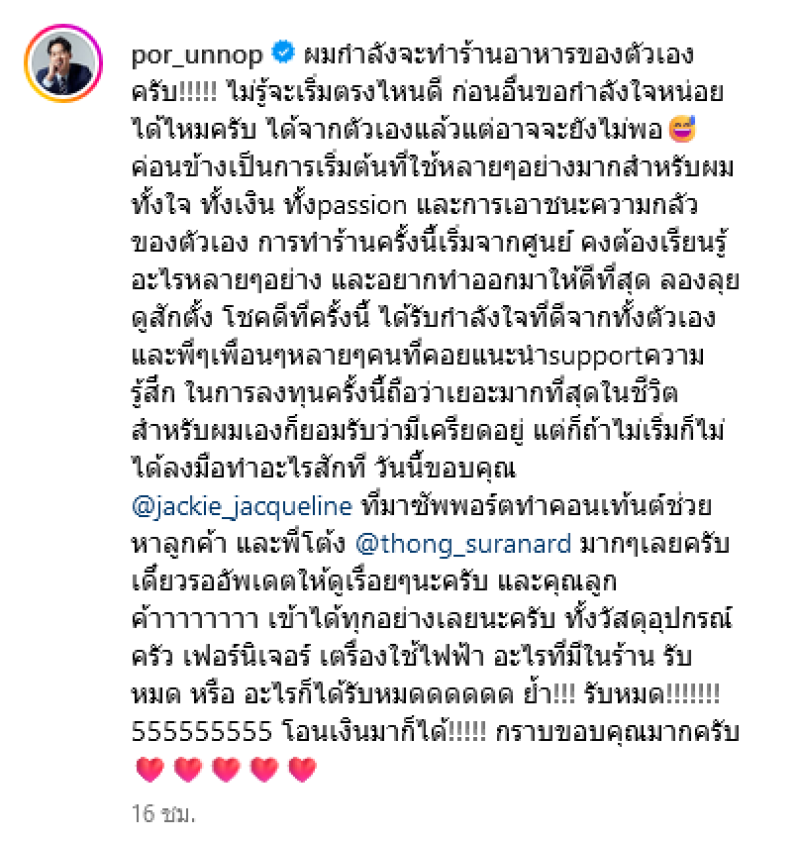 โดยล่าสุด ปอ ได้โพสต์ข้อความว่า ผมกำลังจะทำร้านอาหารของตัวเองครับ ไม่รู้จะเริ่มตรงไหนดี ก่อนอื่นขอกำลังใจหน่อยได้ไหมครับ ได้จากตัวเองแล้วแต่อาจจะยังไม่พอ ค่อนข้างเป็นการเริ่มต้นที่ใช้หลายๆอย่างมากสำหรับผม ทั้งใจ ทั้งเงิน ทั้งpassion และการเอาชนะความกลัวของตัวเอง การทำร้านครั้งนี้เริ่มจากศูนย์ คงต้องเรียนรู้อะไรหลายๆอย่าง และอยากทำออกมาให้ดีที่สุด
