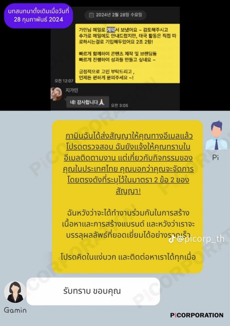 ยังคงมีกระเเสต่อมาเรื่อยๆเมื่อเอเจนซี่ จีกามิน ออกแถลงการณ์ ชี้แจงไทม์ไลน์สัญญากับกามิน ยืนยันสัญญาที่ทำ ไม่เกี่ยวข้องกับการทำงานในไทยเลยไม่เข้าใจทำไมถึงถูกวิจารณ์แง่ลบแบบนั้น สัญญาที่ทำกับกามินไม่เป็นรายลักษณ์อักษรแค่ลงทะเบียน เกี่ยวข้องกับการทำงานที่เกาหลีเท่านั้นบริษัทสนับสนุนชาร์ลีและกามินมาตลอด ทำไมโดนด่า