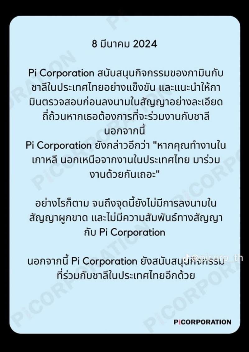 - 28 ก.พ 24 Pi กับกามินได้ประชุมเรื่องสัญญา ในส่วนการทำงาน โดยจำกัดเฉพาะงานในเกาหลีเท่านั้น ส่วนประเทศอื่นๆ คือ อิสระไม่มีข้อผูกมัด เพราะตอนประชุมกามินแจ้งว่า จะร่วมงานกับชาลีที่ไทย