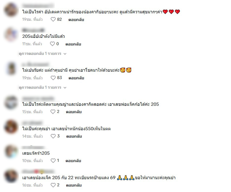 โดยบอกเลยว่าแม้ ย่าเปิ้ล จะไม่มีเลขให้แฟนๆ แต่คอมเมนต์ยังสนั่นเหมือนเดิม อาทิ ไม่เป็นไรค่ะคุณย่า เพราะฝันแล้ว ฝันว่าน้องคากิ มาบอกเลข 579 ,ตามแจ็ค แล้วค่ะงวดนี้ขอให้มา ,ไม่เป็นไรค่ะอัปเดตความน่ารักของน้องคากิก็พอค่ะ ,ไม่เป็นไรค่ะติดตามคุณญ่าและน้องคากิตลอดค่ะ เอาเลขพ่อแจ็คก้อได้ค่ะ 205 ,ติดตามดูความน่ารัก น่าเอ็นดูของน้องค่ะ เรื่องโชคลาภแล้วแต่บุญสัมพันธ์ค่ะ ,งวดนี้เล่นอายุคุณย่าเลยคะ ,ไม่เป็นรัยค่ะคุณย่า..ที่อยู่คือ นน.น้องกับอายุน้องคากิตอนนี้