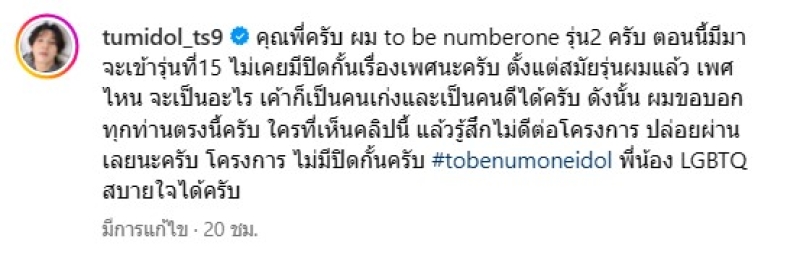 ล่าสุด ทางนักร้อง-พิธีกรหนุ่ม อย่าง ตั้ม วราวุธ หรือ ตั้ม เดอะสตาร์ ได้ออกมาโพสต์ถึงประเด็นดังกล่าวด้วยว่า คุณพี่ครับ ผม to be numberone รุ่น2 ครับ ตอนนี้มีมาจะเข้ารุ่นที่15 ไม่เคยมีปิดกั้นเรื่องเพศนะครับ ตั้งแต่สมัยรุ่นผมแล้ว เพศไหน จะเป็นอะไร เค้าก็เป็นคนเก่งและเป็นคนดีได้ครับ ดังนั้น ผมขอบอกทุกท่านตรงนี้ครับ ใครที่เห็นคลิปนี้ แล้วรู้สึกไม่ดีต่อโครงการ ปล่อยผ่านเลยนะครับ โครงการ ไม่มีปิดกั้นครับ #tobenumoneidol พี่น้อง LGBTQ สบายใจได้ครับ