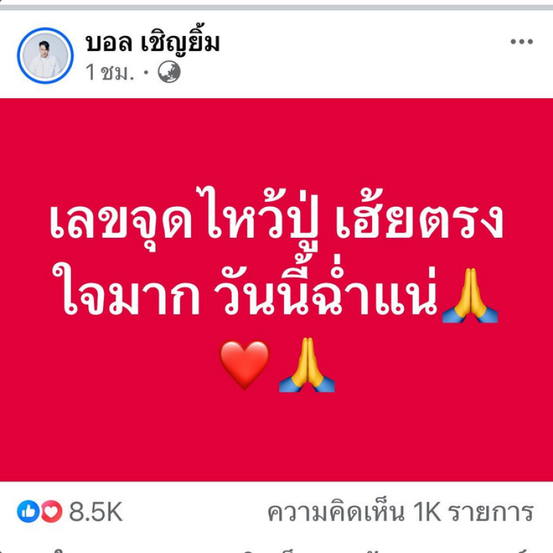 ล่าสุด บอล เชิญยิ้ม ได้เดินทางไปกราบไหว้พ่อปู่ฤาษีนารอด โดยถือฤกษ์ดีวันที่ 9 เดือน 9 จัดผลไม้ชุดใหญ่ถวายเพิ่มความเป็นสิริมงคล ทั้งนี้ยังจุดธูปขอเลขเด็ดพ่อปู่ฤาาีนารอด พร้อมแคปชั่นว่า ขอให้ทุกท่านโชคดี เพื่อนบ้านวันนี้ ถ้าใช่ อย่าลืมไป ไหว้ปู่นะครับ สาธุ และยังบอกอีกว่า เลขจุดไหว้ปู่ เฮ้ยตรงใจมาก วันนี้ฉ่ำแน่ ซึ่งเลขที่ได้นั้นคือ 5-9-3