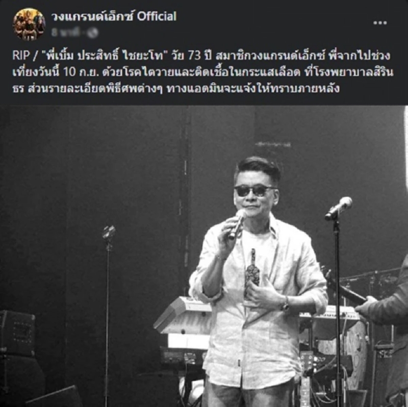 เรียกได้ว่าเป็นอีกหนึ่งข่าวเศร้า ที่โลกออนไลน์เข้ามาแสดงความเสียใจกันเป็นจำนวนมาก หลังเพจแกรนด์เอ็กซ์ ออกมาแจ้งข่าวเศร้าว่า...เบิ้ม-ประสิทธิ์ ไชยะโท มือกลองฝีมือดี ที่เสียชีวิต ด้วยโรคไตวายและติดเชื้อในกระแสเลือด