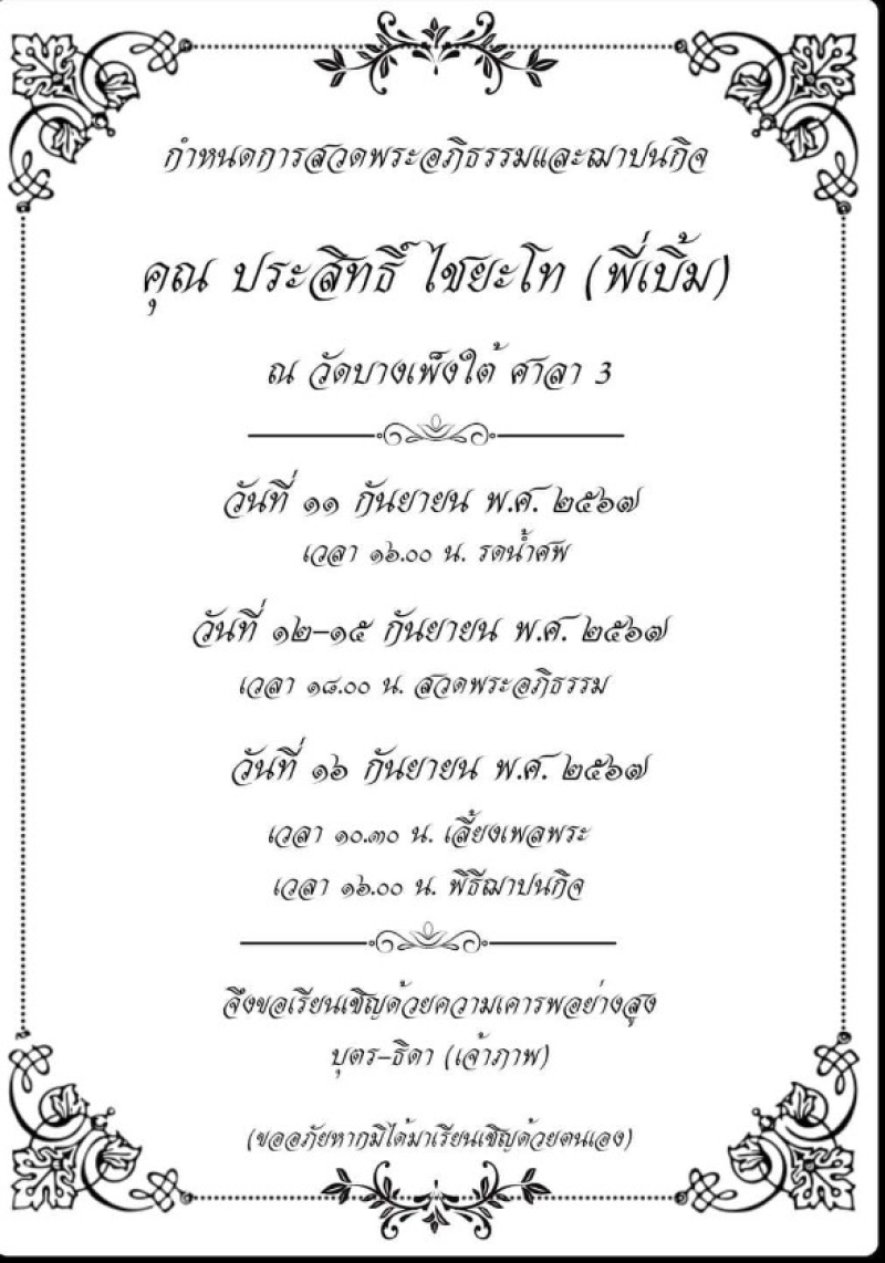 - 14 ก.ย. เวลา 18.00 น. สวดพระอภิธรรมศพ