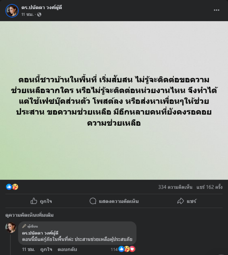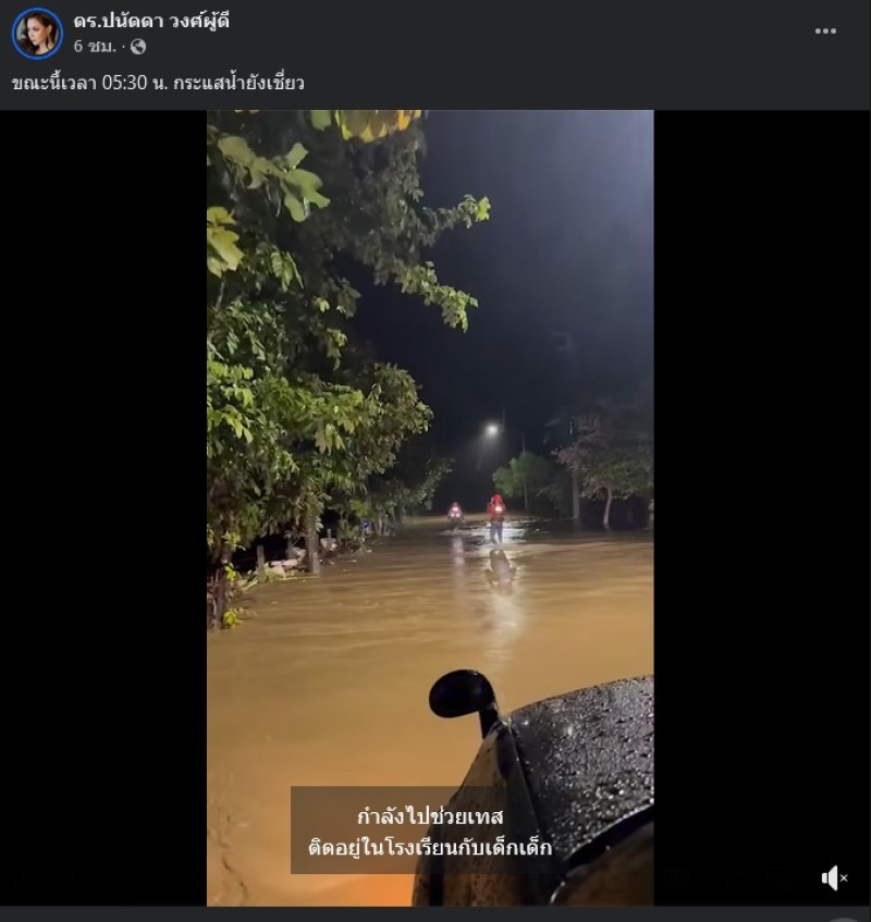 โดย บุ๋ม ปนัดดา ได้ออกมาเเจ้งว่า แจ้งผู้ประสบภัยทุกท่านนะคะ เบื้องต้น อย่าพยายามฝ่ากระแสน้ำออกมาเองนะคะ พยายามขึ้นที่สูง หรือหาที่ยึดเกาะให้ดีที่สุด ตอนนี้ทุกทีมงานกำลังพยายามเข้าไปในพื้นที่ให้ได้ไวที่สุดคะ