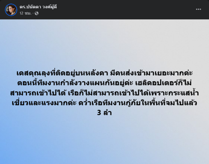 ก่อนหน้านี้ได้อัปเดตเคสของคุณลุงว่า เคสคุณลุงที่ติดอยู่บนหลังคา มีคนส่งเข้ามาเยอะมากคะ ตอนนี้ทีมงานกำลังวางแผนกันอยู่คะ เฮลิคอปเตอร์ก็ไม่สามารถเข้าไปได้ เรือก็ไม่สามารถเข้าไปได้เพราะกระแสน้ำเชี่ยวและแรงมากคะ คว่ำเรือทีมงานกู้ภัยในพื้นที่จมไปแล้ว 3 ลำ