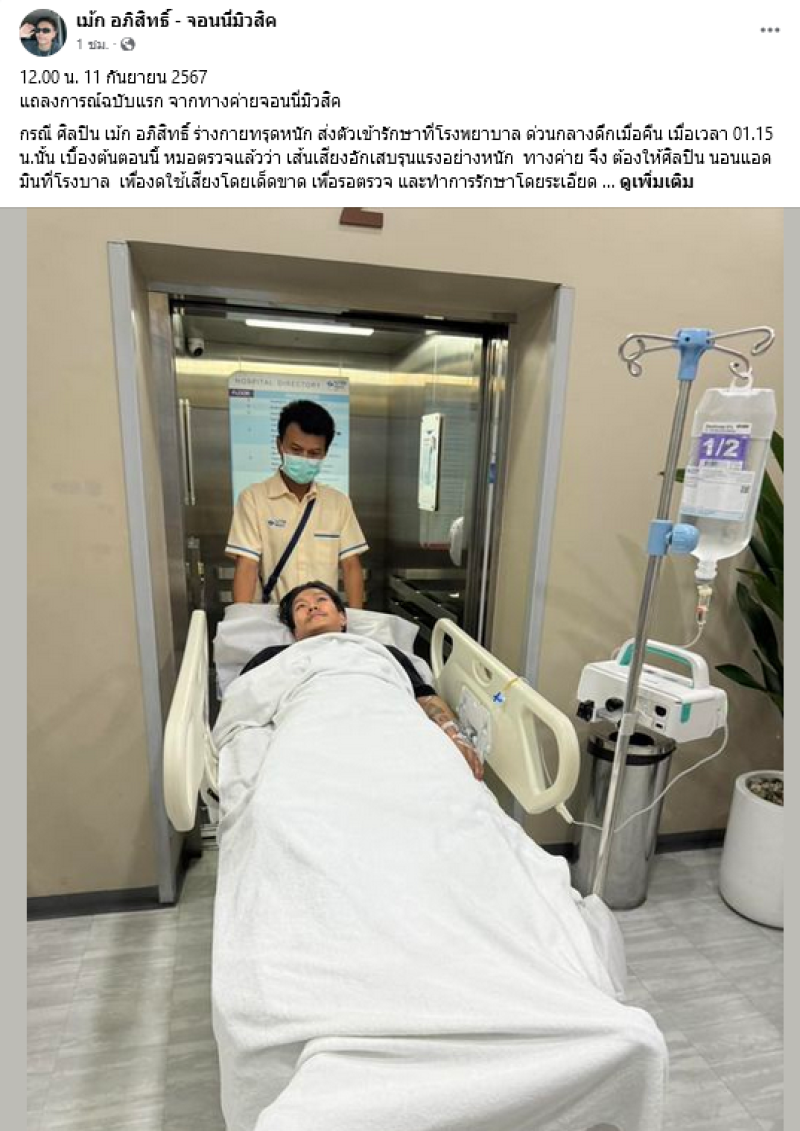 แฟนๆแห่ส่งกำลังใจ หลัง เม้ก อภิสิทธิ์ นักร้องหนุ่มลูกทุ่งชื่อดัง ถูกหามเข้าโรงพยาบาลกลางดึก ตอนนี้อาการหนัก พร้อมระบุว่า ขอให้น้องปลอดภัยนะ ปู่ย่า คุ้มครองน้องผมเด้อครับ ตอนนี้ ถึงโรงบาลแล้วครับ อ้ายเจ็บปวดแทนน้อง นอนบ่หลับเลยตอนนี้ 01.52 น้องกำลังรอหมอครับ