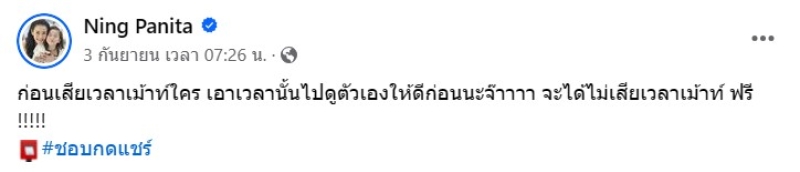 ล่าสุด แม่หนิง ออกมาเคลียร์ถึงประเด็นที่มีการโพสต์ไว้ว่า ก็พูดถึงคนใกล้ๆตัวนี่แหละ และที่เราเขียนแคปชั่นนี้ เพราะเราแค่อยากเตือนสติคนว่า คนเราถ้ามันอยู่ด้วยกัน มันควรจริงใจ เชื่อใจ ไว้ใจแล้วให้ใจ ซึ่งถ้าเราให้เขาไป แล้วเขาไม่รับ เราก็แค่ถอยออกมา
