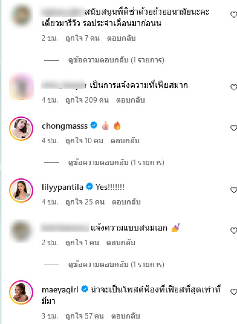 ติช่าขอยืนยันว่าติช่าไม่เคยตกลงหรือยินยอมให้อดีตผู้จัดการหักเงินส่วนต่างใด ๆ ทั้งสิ้น ซึ่งทำให้ติช่าได้รับความเสียหายอย่างมาก ทั้งนี้ ติช่าจะดำเนินคดีนี้จนกว่าจะถึงที่สุด Watch out นะคะ ท่ามกลางแฟนๆแห่คอมเมนต์กันอย่างมาก