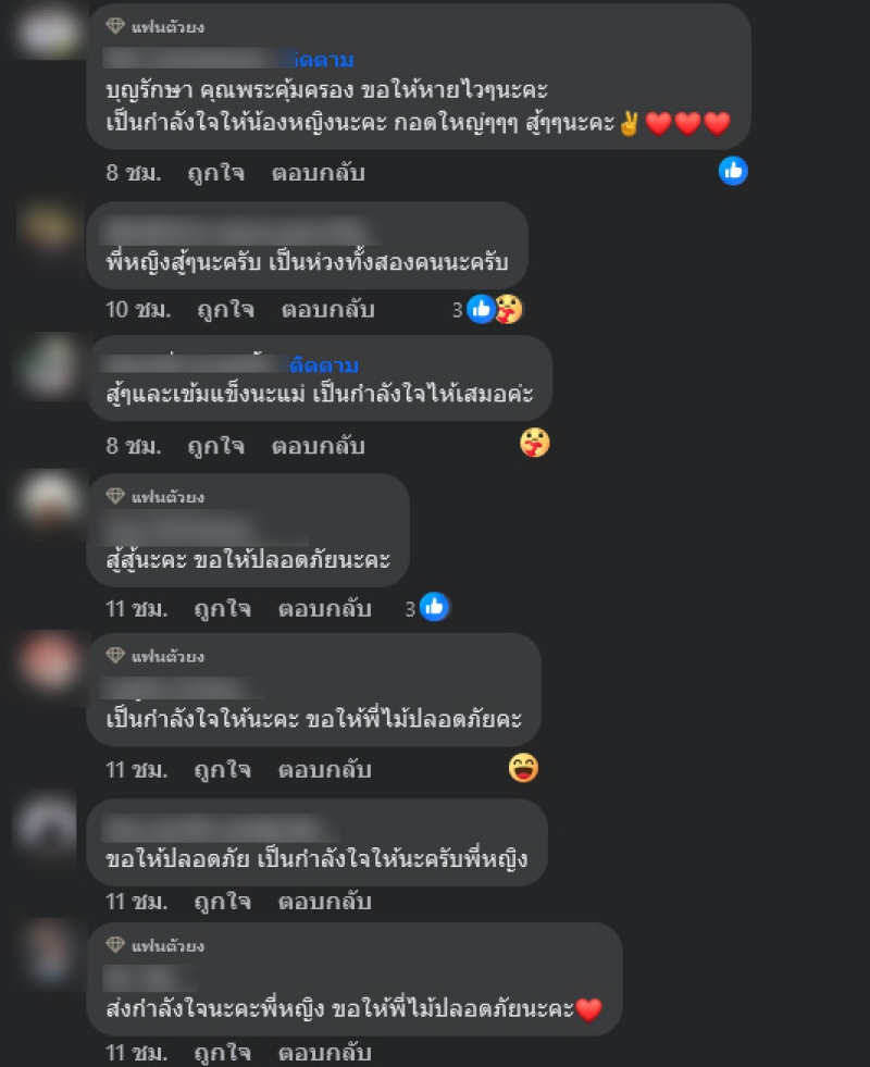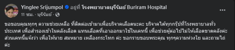 ทั้งนี้ หญิงลี ยัง ขอบคุณคนที่ห่วงใย โทรมาถามไถ่ทั่วประเทศ ทั่วโลก ขอบคุณคนที่บริจาคเลือด ตอนนี้คลังเลือดนำมาใช้กับคุณไม้ เยอะมาก ภาวะเลือดตอนนี้ยังผ่าตัดไม่ได้ ความดันยังไม่คงที่ ค่าเลือดต่ำ ในทางการแพทย์ค่อนข้างจะวิกฤตมาก (ยังไม่ปลอดภัย) แต่ยังสามารถโต้ตอบได้ แต่ในส่วนของกระดูกข้างในหักเยอะ