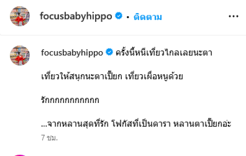 พร้อมเขียนข้อความว่า ครั้งนี้หนีเที่ยวไกลเลยนะตา เที่ยวให้สนุกนะตาเปี๊ยก เที่ยวเผื่อหนูด้วย รักกกกกกกกกกก จากหลานสุดที่รัก โฟกัสที่เป็นดารา หลานตาเปี๊ยกอ่ะ ท่ามกลางแฟนๆเข้ามาคอมเมนต์แสดงความเสียใจอย่างมาก