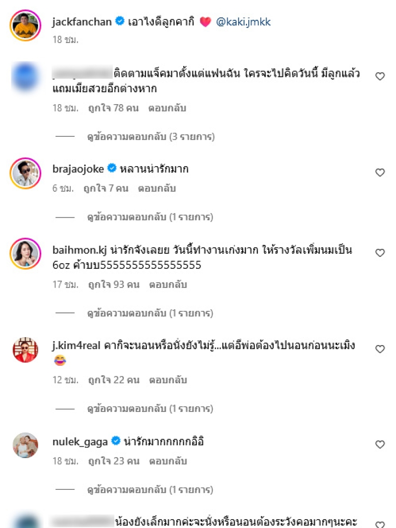 ล่าสุด แจ็ค แฟนฉัน ได้โพสต์คลิปอุ้ม น้องคากิ ขณะพูดคุยเล่นกัน พร้อมเขียนแคปชั่นว่า เอาไงดีลูกคากิ ท่ามกลางแฟนๆเข้ามาคอมเมนต์อย่างมาก อาทิ จะให้พ่อๆเดินคับ55,ผมดกดำดีจังลูก,รู้เรื่องมากเลยคากิ,น้องหน้าเหมือนแม่มาก เป็นต้น ทั้งนี้ยังโพสต์อีกว่า พ่อออกไปทำงานหาเงินก่อนนะเดี๋ยวจะรีบกลับมาหาหนูกับแม่นะครับ #งวดนี้พ่อขออีกงวดได้ไหมลูก 55555555 @kaki.jmkk