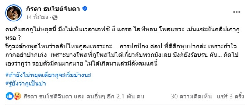 เรียกได้ว่า ก่อนหน้านั้นทาง แม่น้ำหนึ่ง ก็ได้มีประเด็นดรามาแล้ว ล่าสุดเจ้าตัวได้ออกมาโพสต์ฟาด พร้อมระบุแคปชั่นว่า คนที่บอกกูไม่หยุดนี่ มึงไม่เห็นเวลาเอฟซี ฮี่ แตรด ไลฟ์หอน โพสแขวะ เม้นแซะยันคลิปเก่ากูหรอ ? รึกูจะต้องพูดไหมว่าคลิปไหนกูลงเพราะอะ ... การปกป้อง ศลป ที่ดีคือหุบปากค่ะ เพราะถ้าใจกากอย่าปากเก่ง เพราะบางโพสที่กูโพสไม่ได้เกี่ยวกับพวกมึงเลย มึงก็ยังร้อนรน คัน... คิดไปเองว่ากูว่า รอบตัวมีคนมากมาย ไม่ได้เกิดมาแล้วมีสังคมแค่นี้ #ถ้ายังไม่หยุดเดี๋ยวกูจะเริ่มบ้างนะ #รู้ยังว่ากูเป็นบ้า