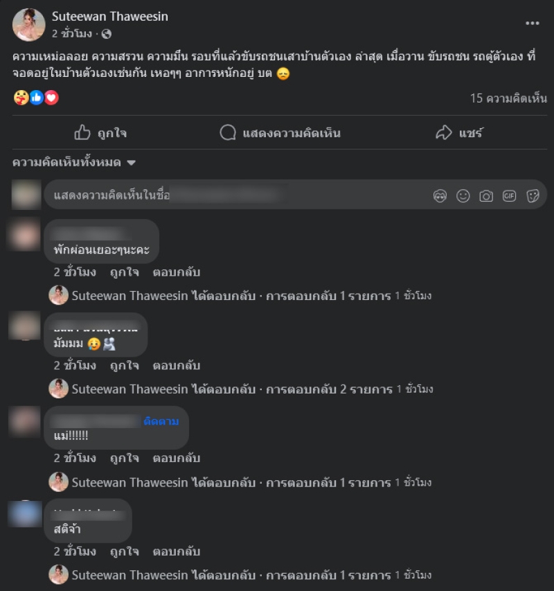 โดย ใบเตย เขียนโพสต์ว่า ความเหม่อลอย ความสรวน ความมึน รอบที่แล้วขับรถชนเสาบ้านตัวเอง ล่าสุด เมื่อวาน ขับรถชนรถตู้ตัวเองที่จอดอยู่ในบ้านตัวเองเช่นกัน เหอะๆๆ อาการหนักอยู่ บต ท่ามกลางแฟนๆแห่เข้ามาคอมเมนต์เป็นห่วงเพียบ