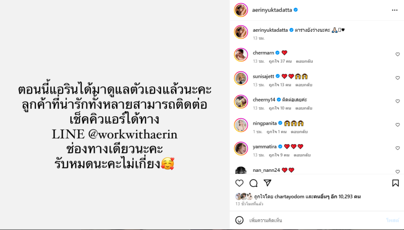 จากกรณีที่ ก่อนหน้านั้น ดาราสาว แอริน ยุกตะทัต ก็ได้ออกมาประกาศเป็นอิสระจากผู้จัดการส่วนตัวเช่นกัน โดยเจ้าตัวได้เผยว่า ตอนนี้แอรินได้มาดูแลตัวเองแล้วนะคะ ลูกค้าที่น่ารักทั้งหลายสามารถติดต่อเช็คคิวแอร์ได้ทาง LINE @workwithaerin ช่องทางเดียวนะคะ รับหมดนะคะไม่เกี่ยง นอกจากนี้ยังบอกอีกว่า ตารางยังว่างนะคะ และยังมีดาราอีกหลายคนที่ออกมาเลิกจ้าง ผจก.คนนั้นด้วยนั้นเอง