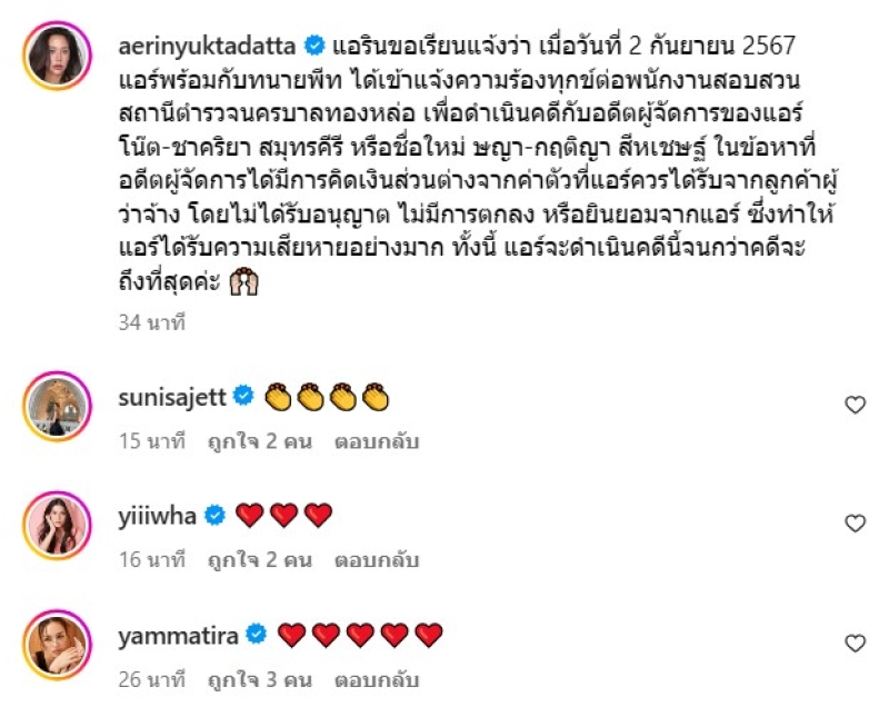 ล่าสุด ทางแอริน ได้ออกมาโพสต์ว่าได้ไปแจ้งความถึงอดีต ผจก.คนนั้นแล้ว โดยได้เผยว่า แอรินขอเรียนแจ้งว่า เมื่อวันที่ 2 กันยายน 2567 แอร์พร้อมกับทนายพีท ได้เข้าแจ้งความร้องทุกข์ต่อพนักงานสอบสวน สถานีตำรวจนครบาลทองหล่อ เพื่อดำเนินคดีกับอดีตผู้จัดการของแอร์ โน๊ต-ชาคริยา สมุทรคีรี หรือชื่อใหม่ ษญา-กฤติญา สีหเชษฐ์ ในข้อหาที่อดีตผู้จัดการได้มีการคิดเงินส่วนต่างจากค่าตัวที่แอร์ควรได้รับจากลูกค้าผู้ว่าจ้าง โดยไม่ได้รับอนุญาต ไม่มีการตกลง หรือยินยอมจากแอร์ ซึ่งทำให้แอร์ได้รับความเสียหายอย่างมาก ทั้งนี้ แอร์จะดำเนินคดีนี้จนกว่าคดีจะถึงที่สุดค่ะ