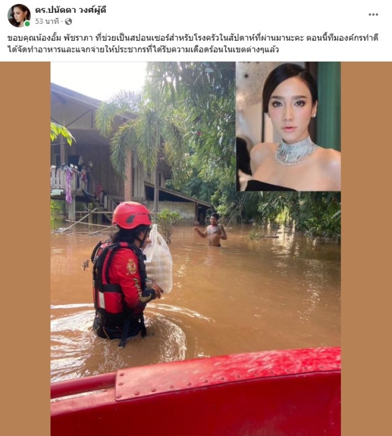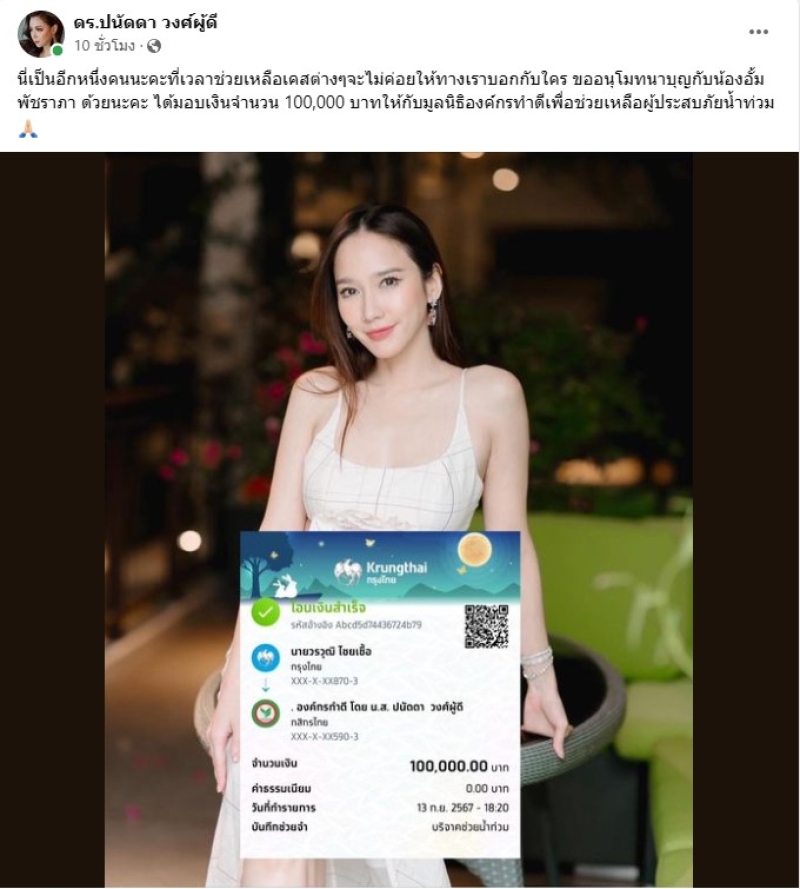 เรียกได้ว่า ช่วงนี้ในภาคเหนือของประเทศไทยได้รับผลกระทบจาดน้ำท่วมหนักในรอบหลายปี ทำให้มีชาวบ้านเดือดร้อนเป็นจำนวนมาก โดยล่าสุดทาง ดร.ปนัดดา วงศ์ผู้ดี ได้ออกมาเผย ซุปตาร์สาว อย่าง อั้ม พัชราภา ก็ได้บริจาคเงินช่วยเหลือเช่นกัน โดนได้ระบุข้อความว่า นี่เป็นอีกหนึ่งคนนะคะที่เวลาช่วยเหลือเคสต่างๆจะไม่ค่อยให้ทางเราบอกกับใคร ขออนุโมทนาบุญกับน้องอั้ม พัชราภา ด้วยนะคะ ได้มอบเงินจำนวน 100,000 บาทให้กับมูลนิธิองค์กรทำดีเพื่อช่วยเหลือผู้ประสบภัยน้ำท่วม