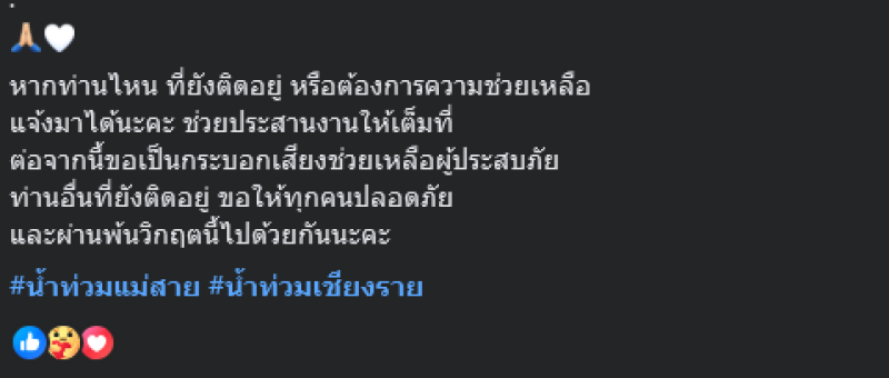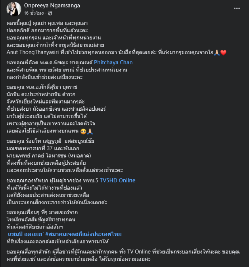 ล่าสุดเมื่อวันที่ 13 ก.ย. 67 ได้ออกมาโพสต์ขอบคุณทุกความช่วยเหลือครอบครัวปลอดภัยแล้วพร้อมกับขอเป็นกระบอกเสียงช่วยคนอื่นที่ประสบภัยน้ำท่วมต่อไป