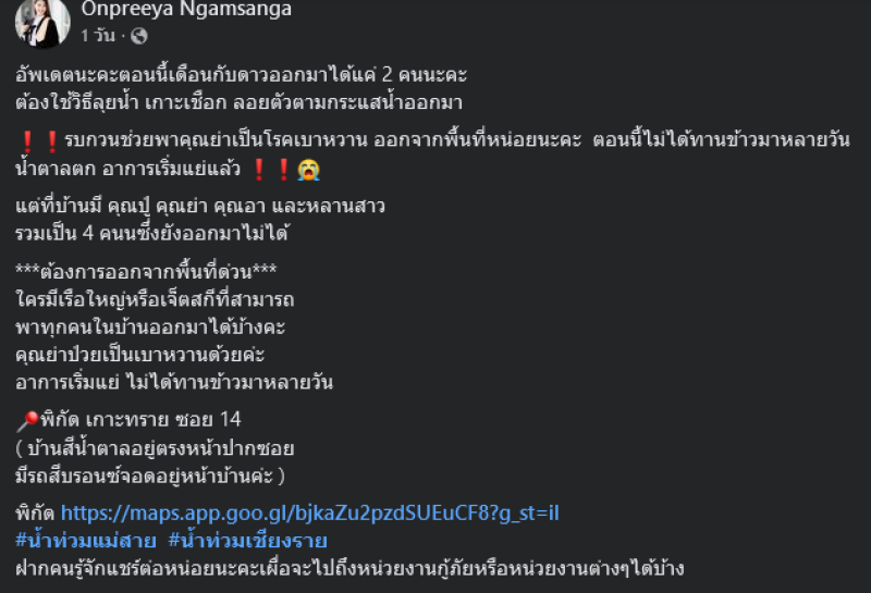 ต้องการออกจากพื้นที่ด่วน ใครมีเรือใหญ่หรือเจ็ตสกีที่สามารถ พาทุกคนในบ้านออกมาได้บ้างคะ คุณย่าป่วยเป็นเบาหวานด้วยค่ะ อาการเริ่มแย่ ไม่ได้ทานข้าวมาหลายวัน พิกัด เกาะทราย ซอย 14(บ้านสีน้ำตาลอยู่ตรงหน้าปากซอยมีรถสีบรอนซ์จอดอยู่หน้าบ้านค่ะ )