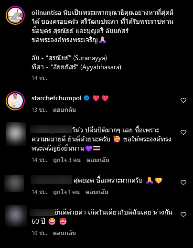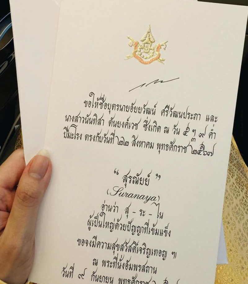 โดยได้เขียนข้อความผ่านอินสตราแกรมส่วนตัวว่า นับเป็นพระมหากรุณาธิคุณอย่างหาที่สุดมิได้ ของครอบครัว ศรีวัฒนประภา ที่ได้รับพระราชทานชื่อบุตร สุรณัยย์ และบุญตรี อัยยภัสร์ ขอพระองค์ทรงพระเจริญ อัย - "สุรณัยย์" (Suranayya) ทิสา - "อัยยภัสร์" (Ayyabhasara)