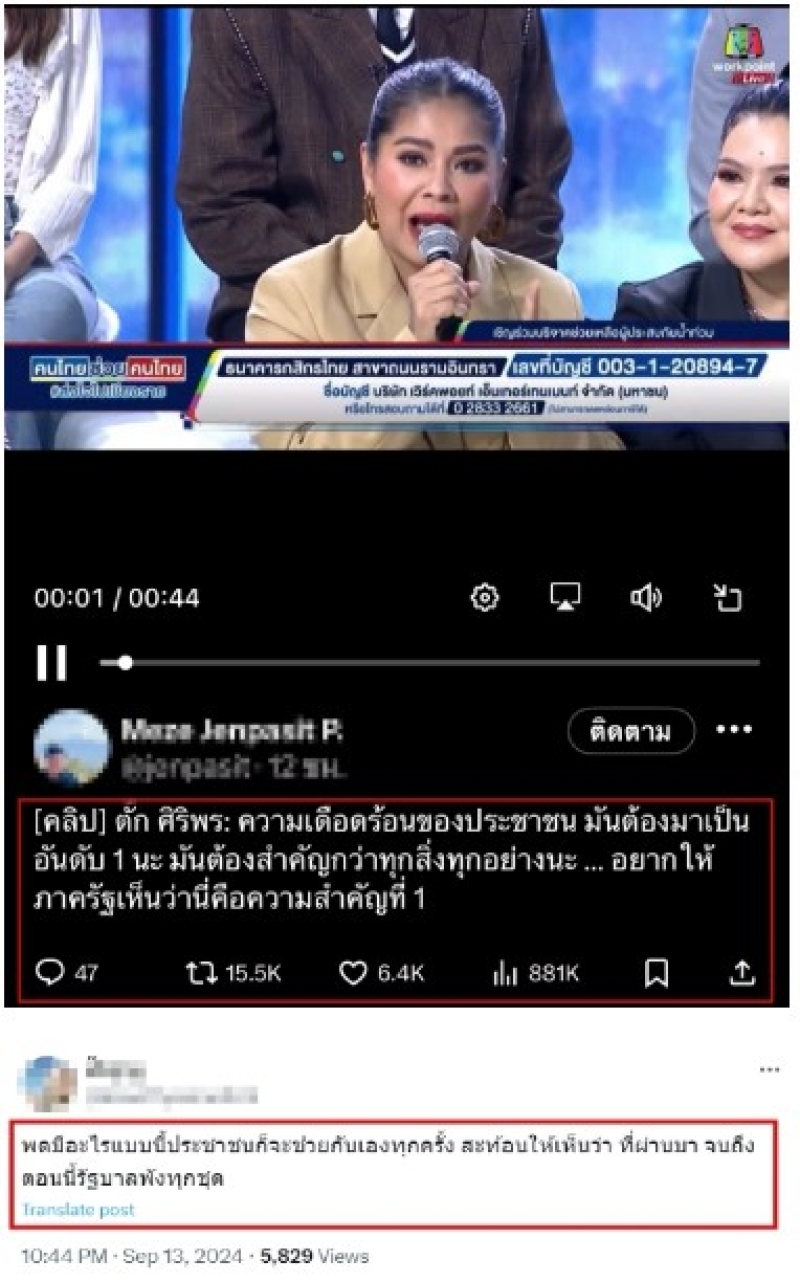 โดยคลิปดังกล่าวที่ชาวเน็ตแห่แชร์นั้นคือ การแสดงมุมมองเกี่ยวกับเรื่องการช่วยเหลือประชาชนของหน่วยงานรัฐ ที่ดูเหมือนว่าจะถูกเพ่งเล็งโยงการเมืองที่เดือดไม่แพ้กัน?