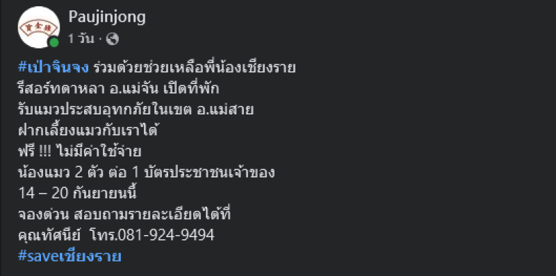 เป่าจินจง ร่วมด้วยช่วยเหลือพี่น้องเชียงราย รีสอร์ตดาหลา อ.แม่จัน เปิดที่พักรับแมวประสบอุทกภัยในเขต อ.แม่สาย ฝากเลี้ยงแมวกับเราได้ฟรี !!! ไม่มีค่าใช้จ่าย น้องแมว 2 ตัว ต่อ 1 บัตรประชาชนเจ้าของ 14 20 กันยายนนี้ จองด่วน!