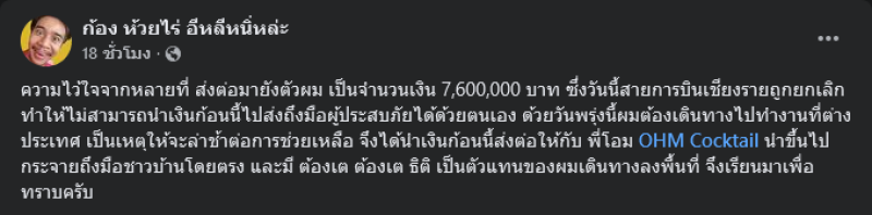 และได้ออกมาอัปเดตยอดเงินว่า ความไว้ใจจากหลายที่ ส่งต่อมายังตัวผม เป็นจำนวนเงิน 7,600,000 บาท ซึ่งวันนี้สายการบินเชียงรายถูกยกเลิก ทำให้ไม่สามารถนำเงินก้อนนี้ไปส่งถึงมือผู้ประสบภัยได้ด้วยตนเอง ด้วยวันพรุ่งนี้ผมต้องเดินทางไปทำงานที่ต่างประเทศ เป็นเหตุให้จะล่าช้าต่อการช่วยเหลือ จึงได้นำเงินก้อนนี้ส่งต่อให้กับ พี่โอม OHM Cocktail นำขึ้นไปกระจายถึงมือชาวบ้านโดยตรง และมี ต้องเต ต้องเต ธิติ เป็นตัวแทนของผมเดินทางลงพื้นที่ จึงเรียนมาเพื่อทราบครับ