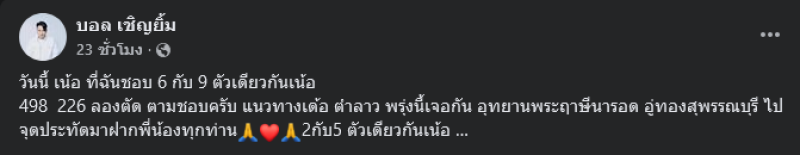 ล่าสุดได้จุดธูปสักการะพ่อปู่ฤาษีนารอด และได้นำเลขมาฝากแฟนๆพร้อมเขียนข้อความว่า วันนี้ เน้อ ที่ฉันชอบ 6 กับ 9 ตัวเดียวกันเน้อ 498 226 ลองตัด ตามชอบครับ แนวทางเด้อ ตำลาว พรุ่งนี้เจอกัน อุทยานพระฤาษีนารอด อู่ทองสุพรรณบุรี ไปจุดประทัดมาฝากพี่น้องทุกท่าน 2 กับ 5 ตัวเดียวกันเน้อ