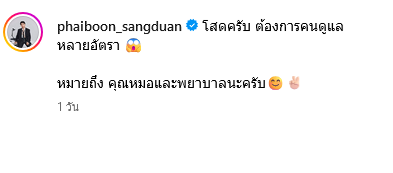 แต่ล่าสุด ครูไพบูลย์ ได้โพสต์ข้อความพร้อมภาพตนเองขณะนอนให้น้ำเกลืออยู่โรงพยาบาล พร้อมเขียนแคปชั่นว่า โสดครับ ต้องการคนดูแลหลายอัตรา หมายถึงคุณหมอและพยาบาลนะครับ