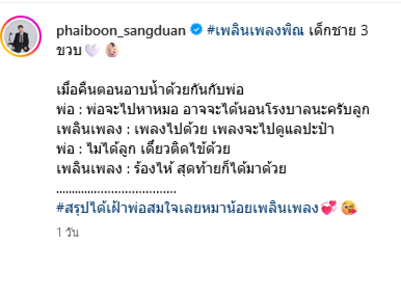 ต่อมา ครูไพบูลย์ ได้โพสต์อีกว่า #เพลินเพลงพิณ เด็กชาย 3 ขวบ เมื่อคืนตอนอาบน้ำด้วยกันกับพ่อ